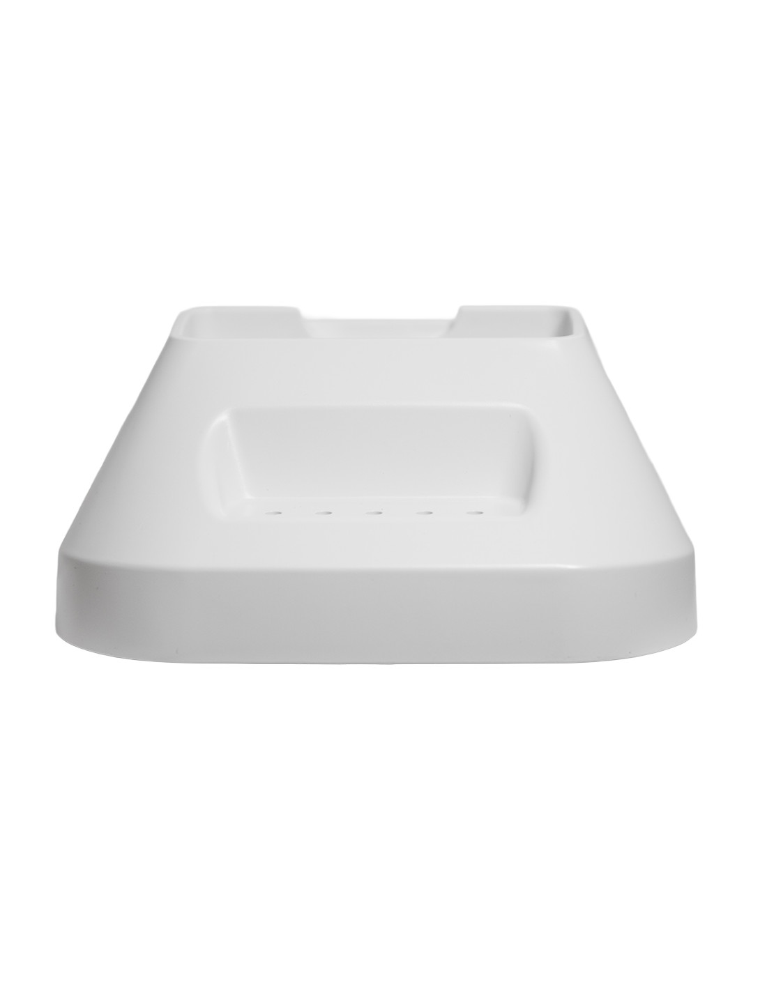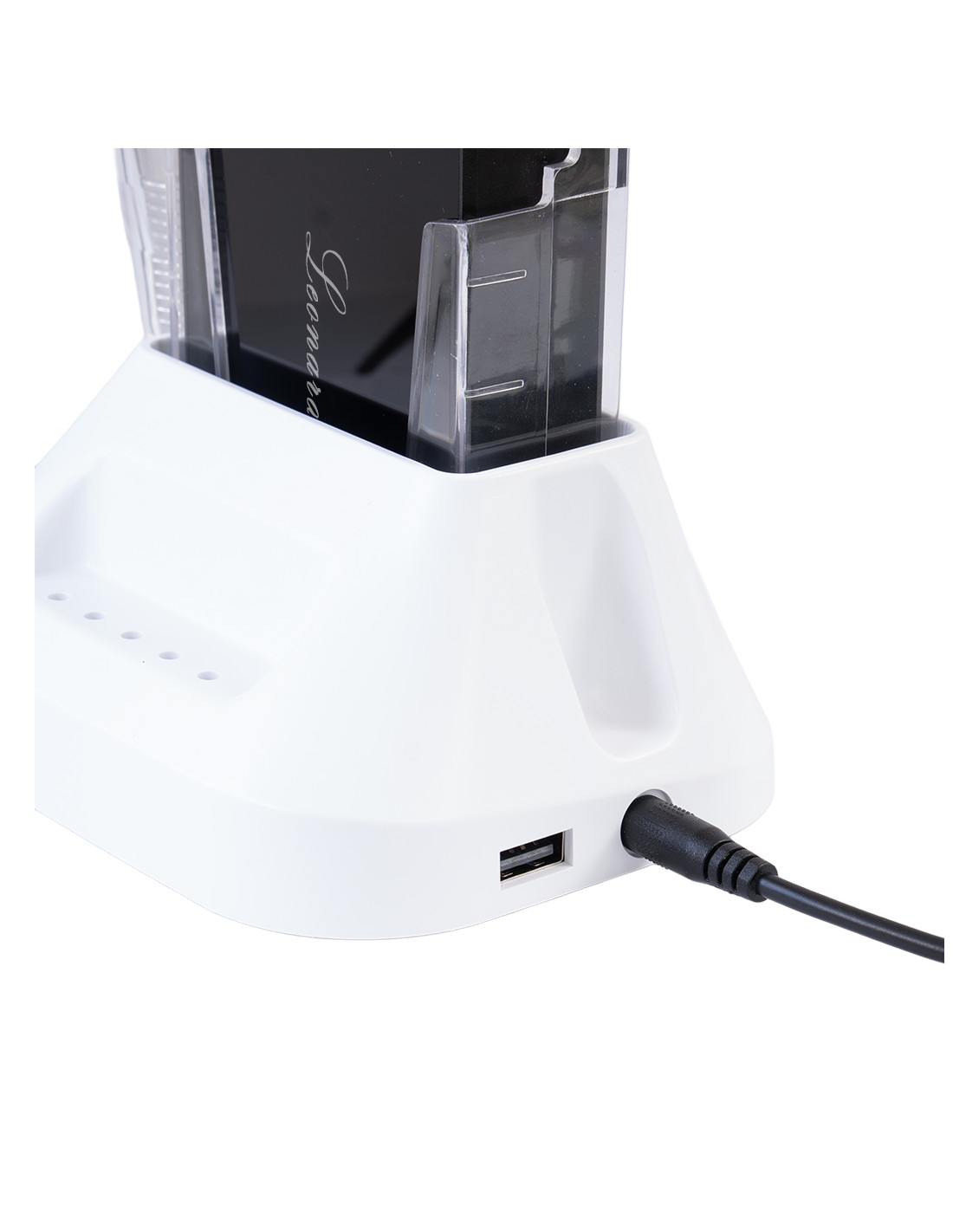 La ricarica può avvenire tramite base di ricarica oppure collegando direttamente il caricabatterie all’unità di controllo. La base è dotata di porta USB 2.0, utile per alimentare o ricaricare dispositivi esterni sul piano di lavoro.